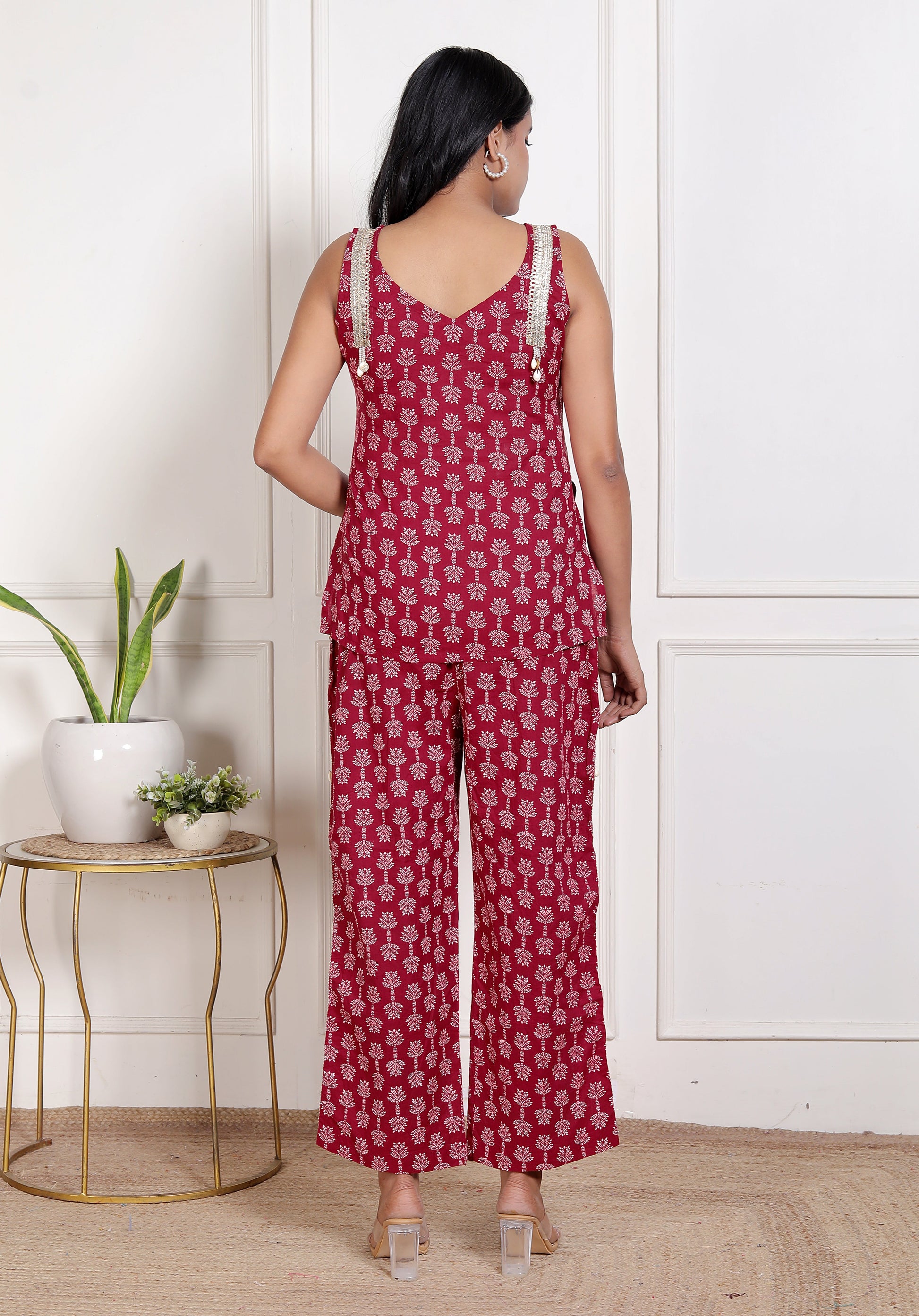 Elevate your wardrobe with the timeless charm of our Sweet Red Flower Bagru Hand Print Pant Set Adorned with authentic Bagru hand block printing, this piece showcases delicate red floral motifs that bring a vibrant, refreshing appeal. Made from soft, breathable cotton, it ensures comfort while keeping your style effortlessly graceful—perfect for both everyday wear and special occasions.